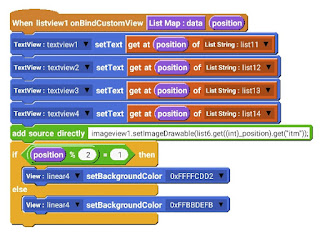 12. Add a new event ListView onBindCustomView, and set the text of all TextViews in CustomView, to the String lists list11, list12, list13, and list14. Also add code to set icons as image of imageview1. The blocks to be used is shown in image below.